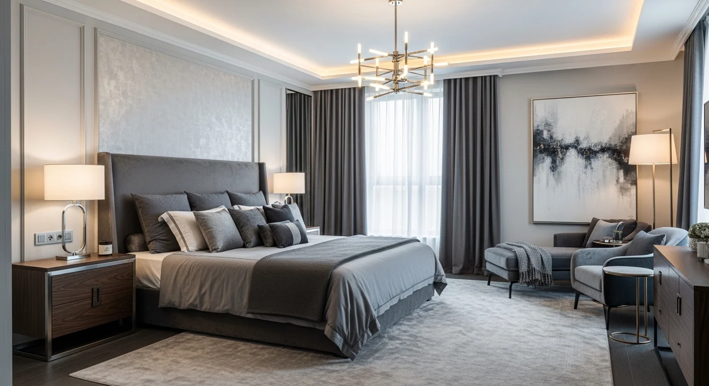 Velvet textures add richness. Statement lighting enhances mood. Minimal decor keeps focus. Gray walls feel refined. Furniture looks premium. The bedroom feels indulgent.