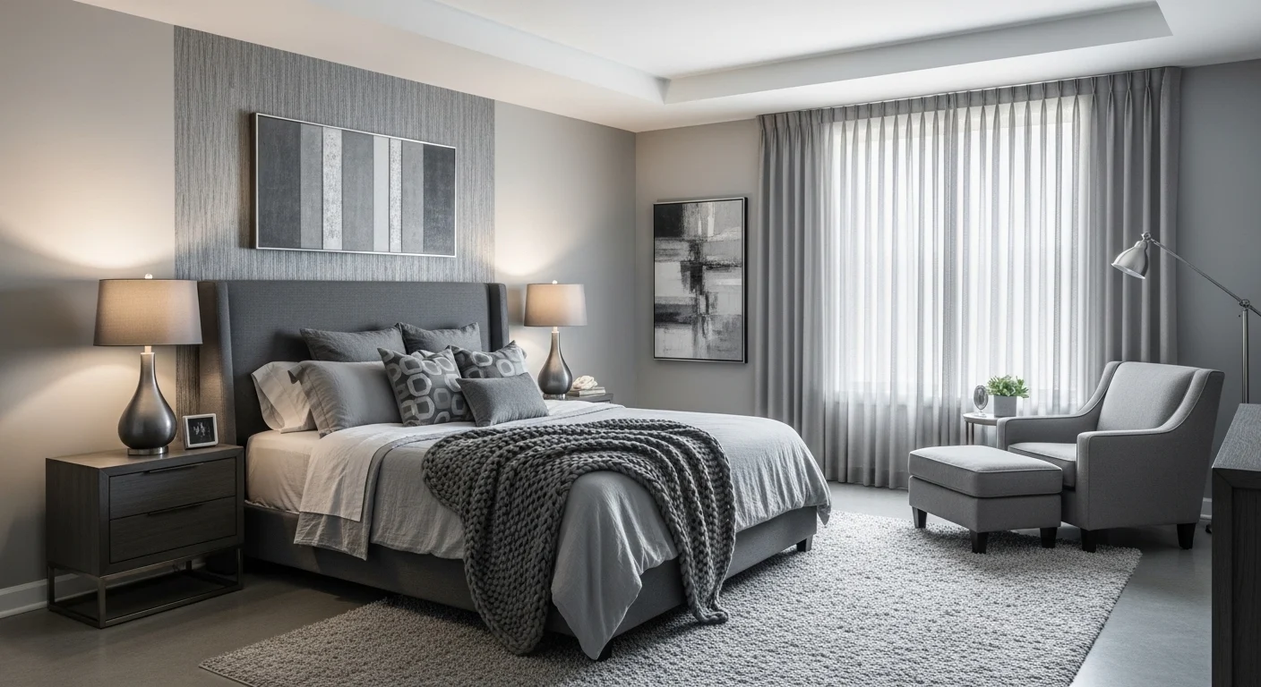 Different gray tones add interest. Soft textiles enhance comfort. Lighting separates shades. Minimal decor keeps harmony. Furniture blends seamlessly. The bedroom feels serene.